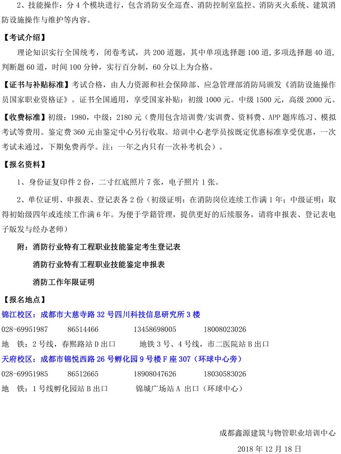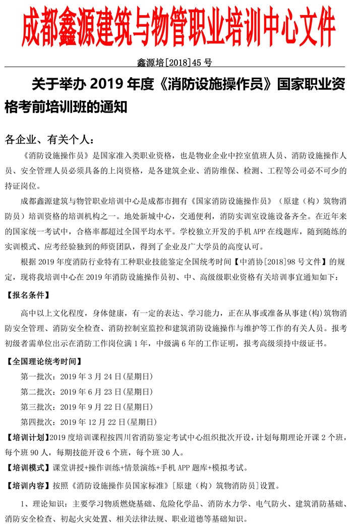 【通知】关于举办2019年度《消防设施操作员》国家职业资格考前培训班的通知