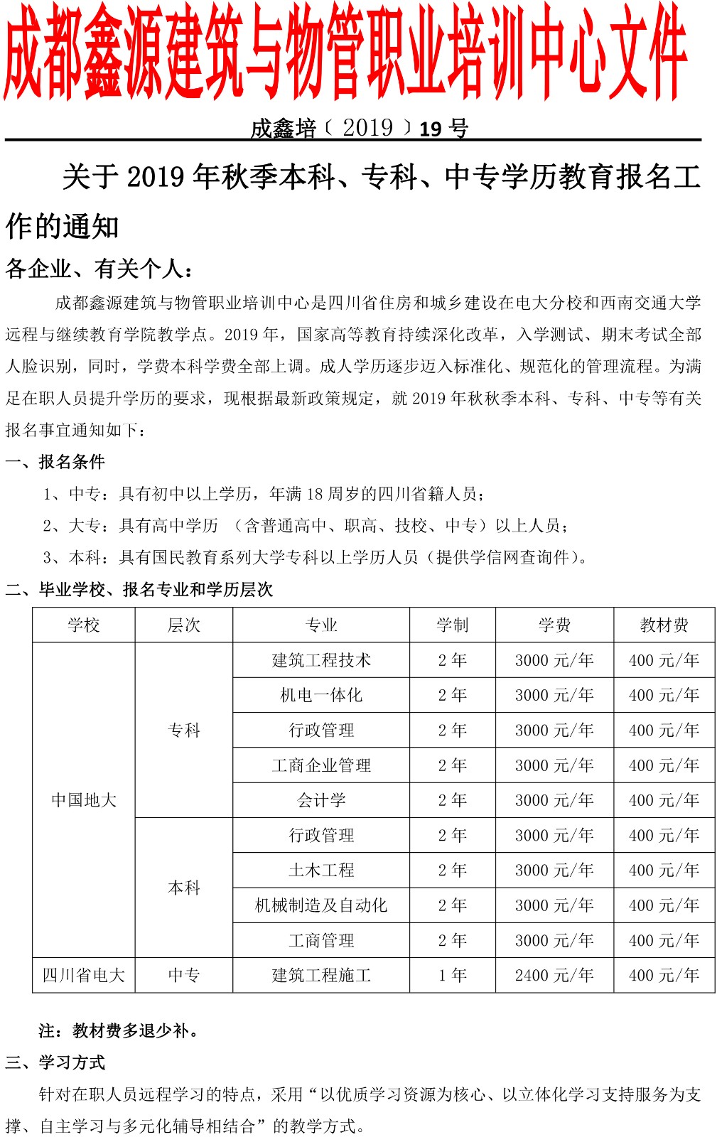 【通知】关于2019年秋季本科、专科、中专学历教育报名工作的通知