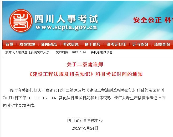 2013年二级建造师《建设工程法规及相关知识》科目考试时间的通知