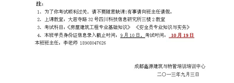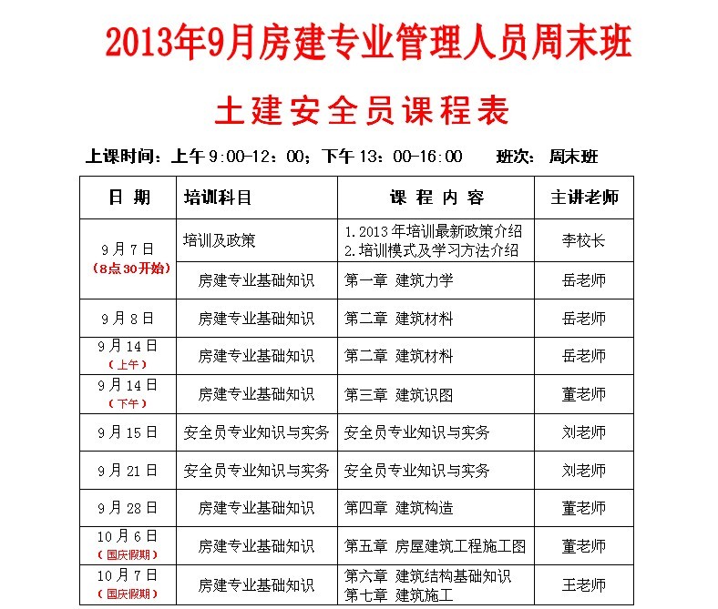 2013年下半年房建安全员周末班课程表